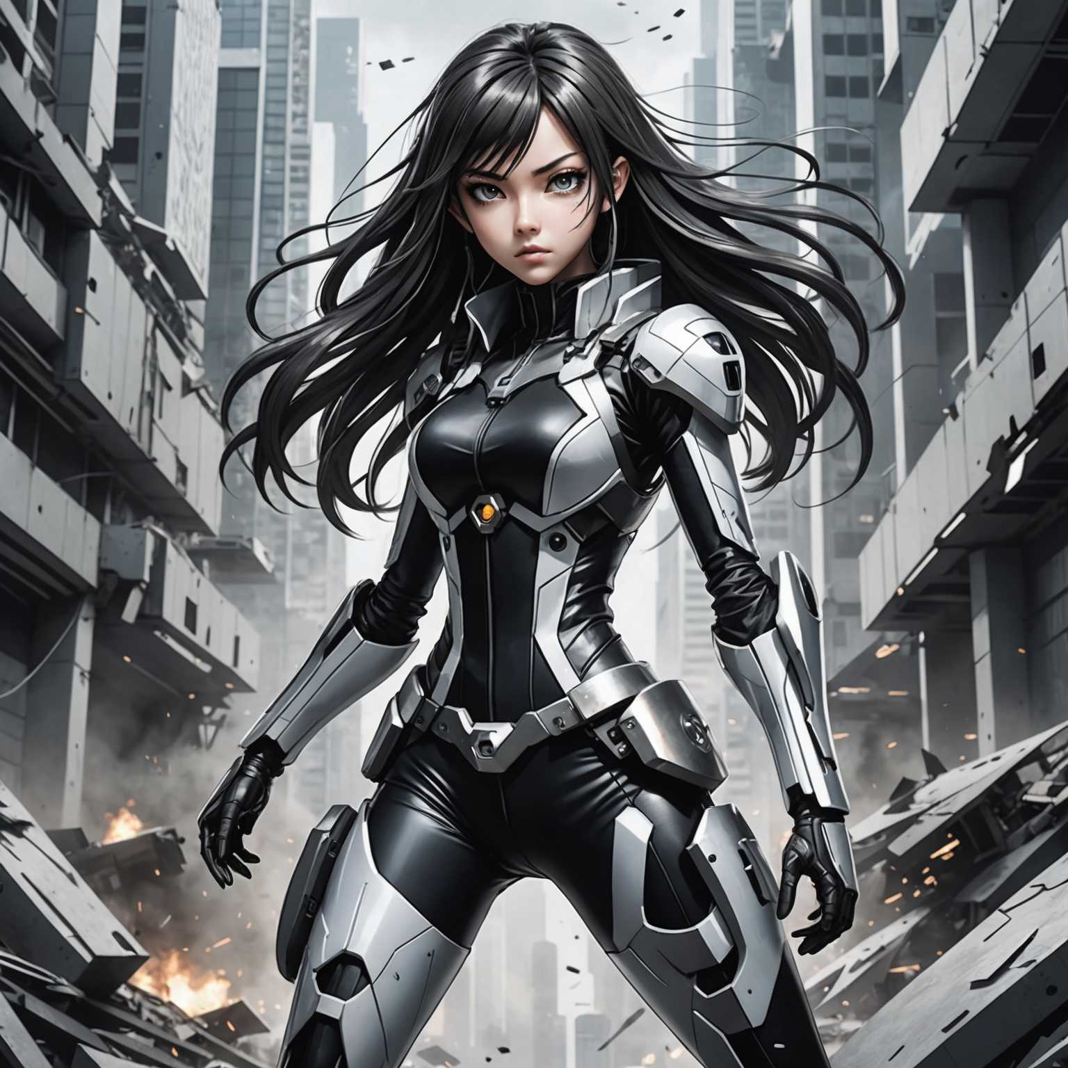 Die Darstellung zeigt eine dramatische Szene im Stil einer schwarz-weißen Grafiknovelle. Im Mittelpunkt steht ein junges, entschlossen aussehendes Anime-Mädchen mit großen, ausdrucksstarken Augen und fließendem Haar. Sie trägt ein detailliertes, futuristisches Outfit mit verschiedenen metallischen und stofflichen Texturen. Ihre Pose deutet darauf hin, dass sie sich mitten in einer Actionszene befindet. Um sie herum ist der Hintergrund akribisch detailliert mit scharfen Kontrasten und dynamischen Schattierungen, die eine chaotische städtische Umgebung mit hohen Gebäuden, Trümmern und futuristischer Technologie darstellen. Die gesamte Komposition ist intensiv und voller Bewegung und fängt die energiegeladene Atmosphäre eines Höhepunktes in einer Handlung ein.