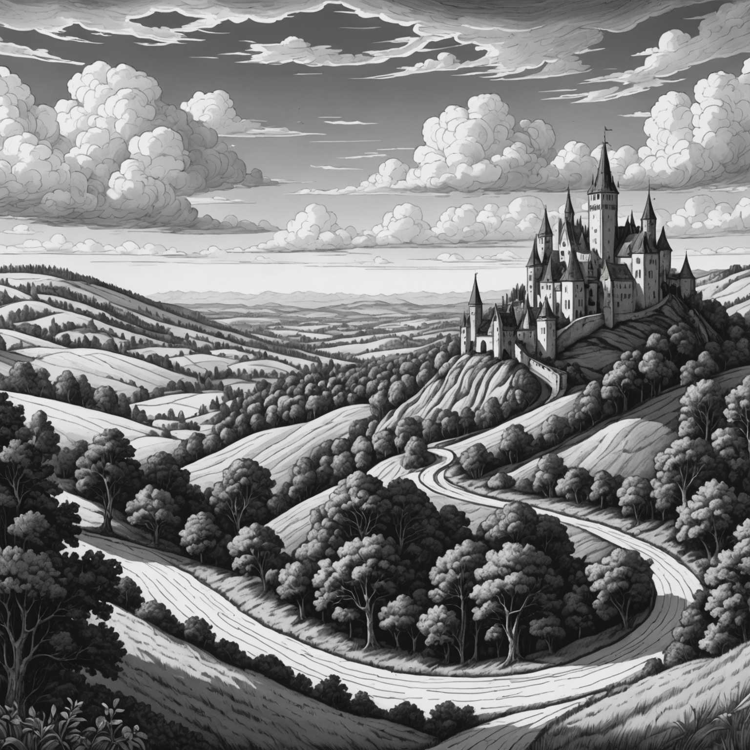Eine detaillierte Schwarz-Weiß-Linienzeichnung im mittelalterlichen Fantasiestil. Der Hintergrund zeigt hügelige Landschaften, Bäume und einen detaillierten Himmel mit Wolken.