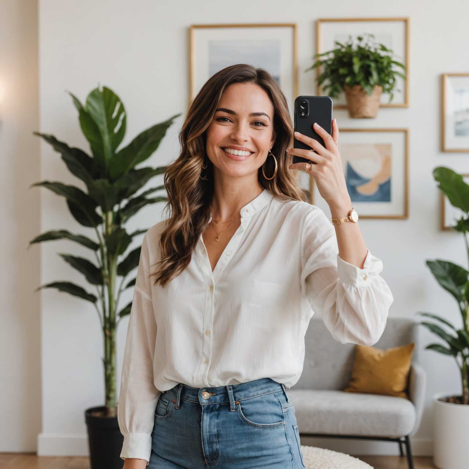 Eine Frau macht ein Selfie mit ihrem Smartphone. Sie lächelt und trägt ein stilvolles, lässiges Outfit: eine locker sitzende weiße Bluse, eine modische blaue Jeans und einige zarte Accessoires, darunter eine goldene Halskette und kleine Creolen. Ihr Haar ist in weichen Wellen gestylt und fällt ihr über die Schultern. Sie steht in einem gut beleuchteten Raum mit modernem Interieur, hellen Wänden und minimalistischer Dekoration. Im Hintergrund sind eine große Zimmerpflanze und gerahmte Kunstwerke an der Wand zu sehen. Das Bild fängt einen unbeschwerten und selbstbewussten Moment ein und betont Mode und soziale Medien Ästhetik.