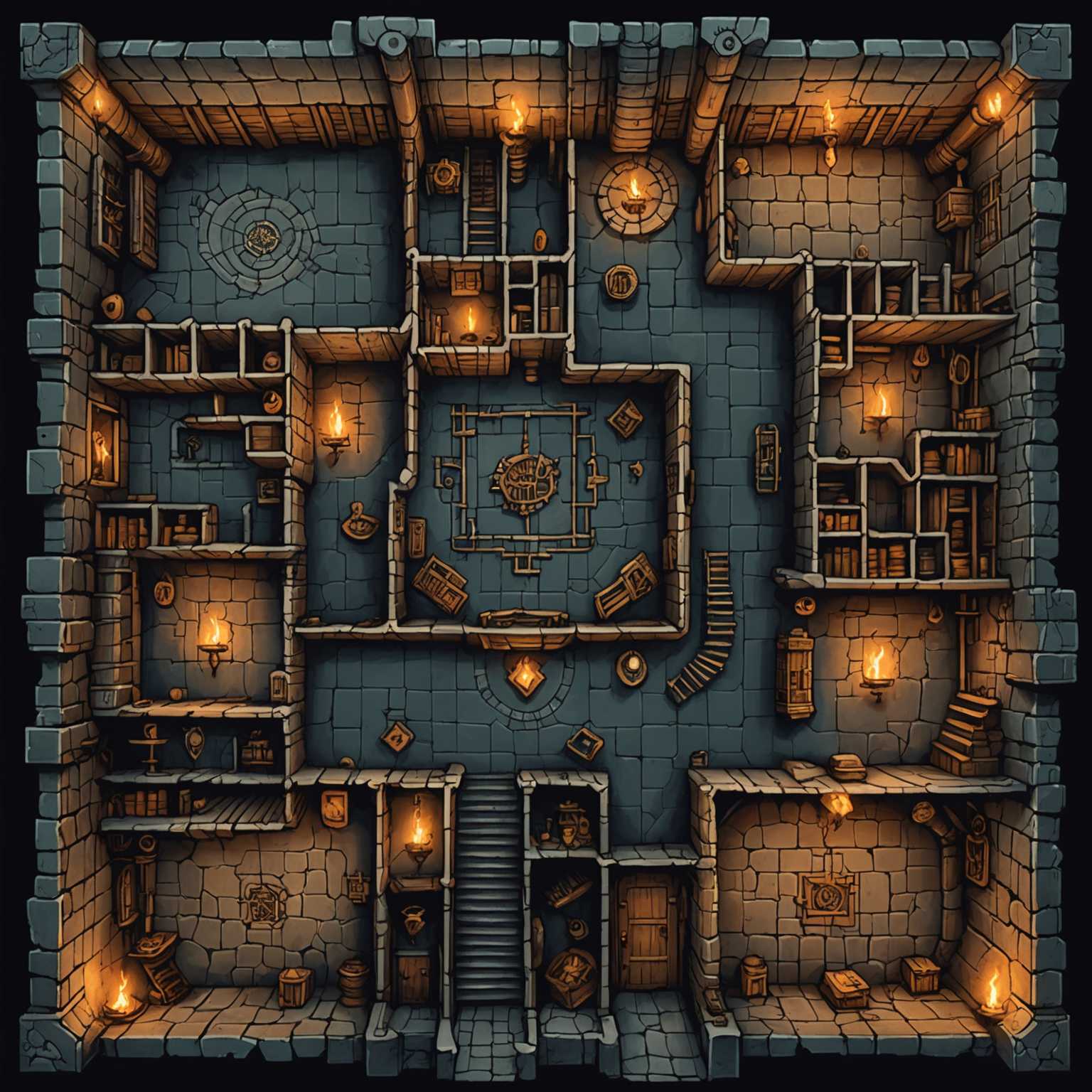 Die Abbildung zeigt eine detaillierte und aufwendig gezeichnete Karte eines dunklen, unterirdischen Dungeons, wie sie typischerweise in Tabletop-RPG-Spielen verwendet wird. Die Karte ist voller gewundener Korridore, geheimer Türen, verschiedener miteinander verbundener Räume und Kammern, die mit Fallen und versteckten Schätzen gefüllt sind. Einige Räume enthalten ominöse Symbole, antike Ruinen und verstreute Skelette, die auf vergangene Abenteurer hinweisen, die ihr Ende gefunden haben. Fackeln säumen die Wände und werfen flackerndes Licht und Schatten. Es gibt Bereiche, die wie antike Bibliotheken, Schatzkammern, Alchemielabore, Gefängniszellen und unheimliche Opferaltäre aussehen. Verschiedene Abschnitte sind mit Beschriftungen oder Symbolen gekennzeichnet, die Gefahrenzonen, magische Bereiche oder sichere Zufluchtsorte anzeigen. Die Atmosphäre ist dunkel, mysteriös und sowohl für Abenteurer, die Ruhm und Reichtum suchen, voller Gefahren als auch verlockend.