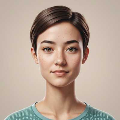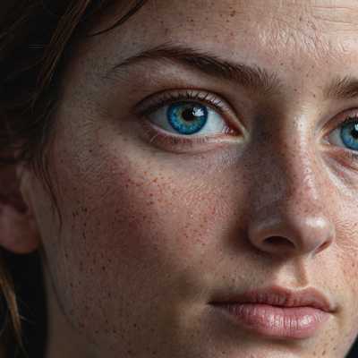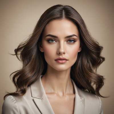 Das Bild zeigt eine junge Frau mit glatter, heller Haut, strahlend blauen Augen und langen, fließenden, kastanienbraunen Haaren, die über ihre Schultern fallen. Sie hat einen gelassenen Ausdruck, leicht geöffnete Lippen und ein subtil angedeutetes Lächeln. Ihr Make-up ist minimal und betont ihre natürliche Schönheit, mit nur einem Hauch von Mascara und einer weichen rosa Lippenfarbe. Sie trägt eine einfache, elegante Bluse und eine zarte Halskette, die ihren Halsausschnitt ergänzt. Der Hintergrund ist sanft verschwommen, sodass der Fokus ganz auf ihrem Gesicht liegt. Das Licht ist weich und gleichmäßig, hebt ihre Gesichtszüge sanft hervor und schafft eine warme, einladende Atmosphäre.